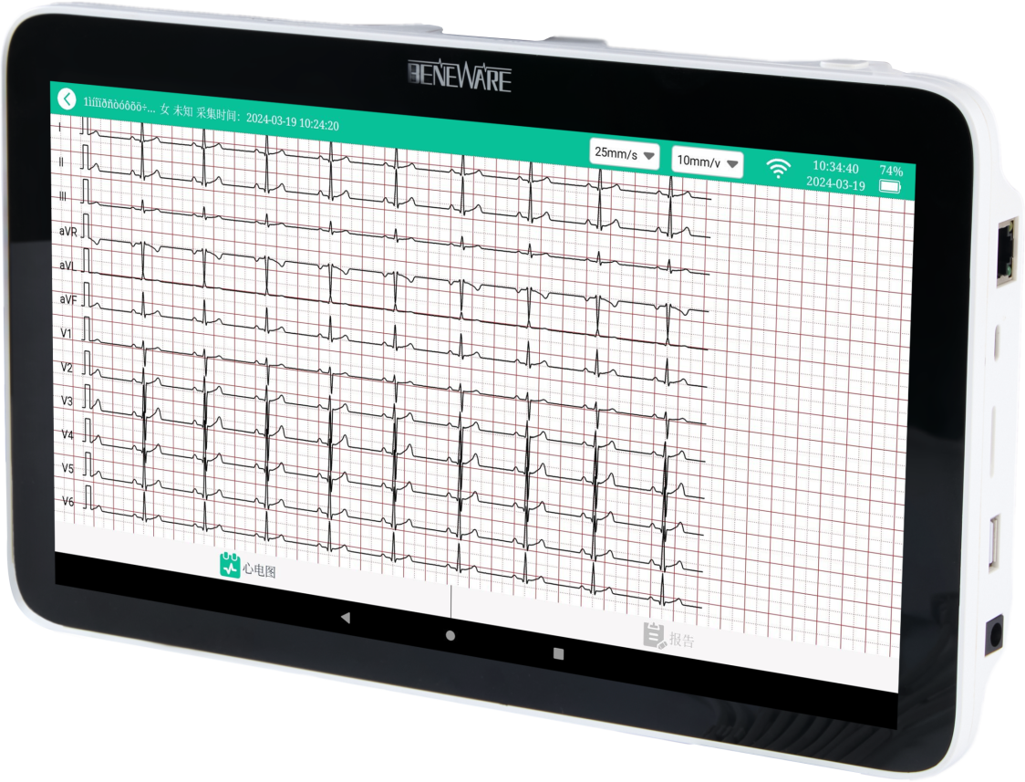 同步12导联心电图,高达10240Hz采样,彩色触摸屏,内置FLASH存储,最长可支持200个